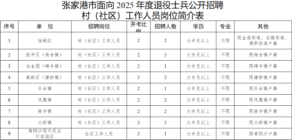 附件1:张家港市面向2025年度退役士兵公开招聘村(社区)工作人员岗位简介表